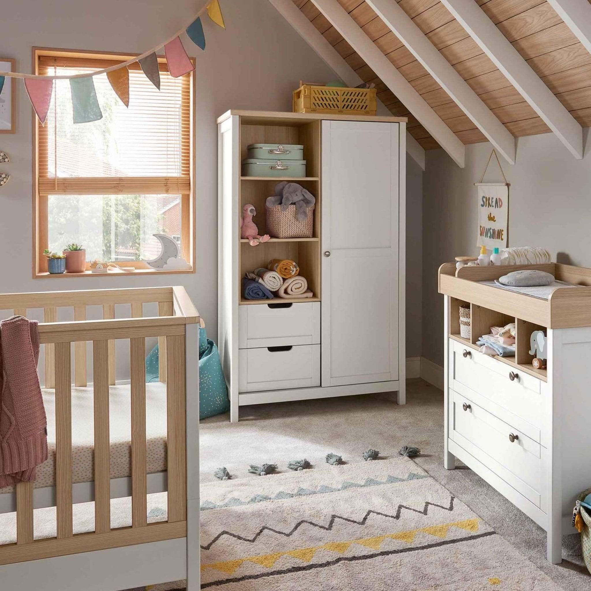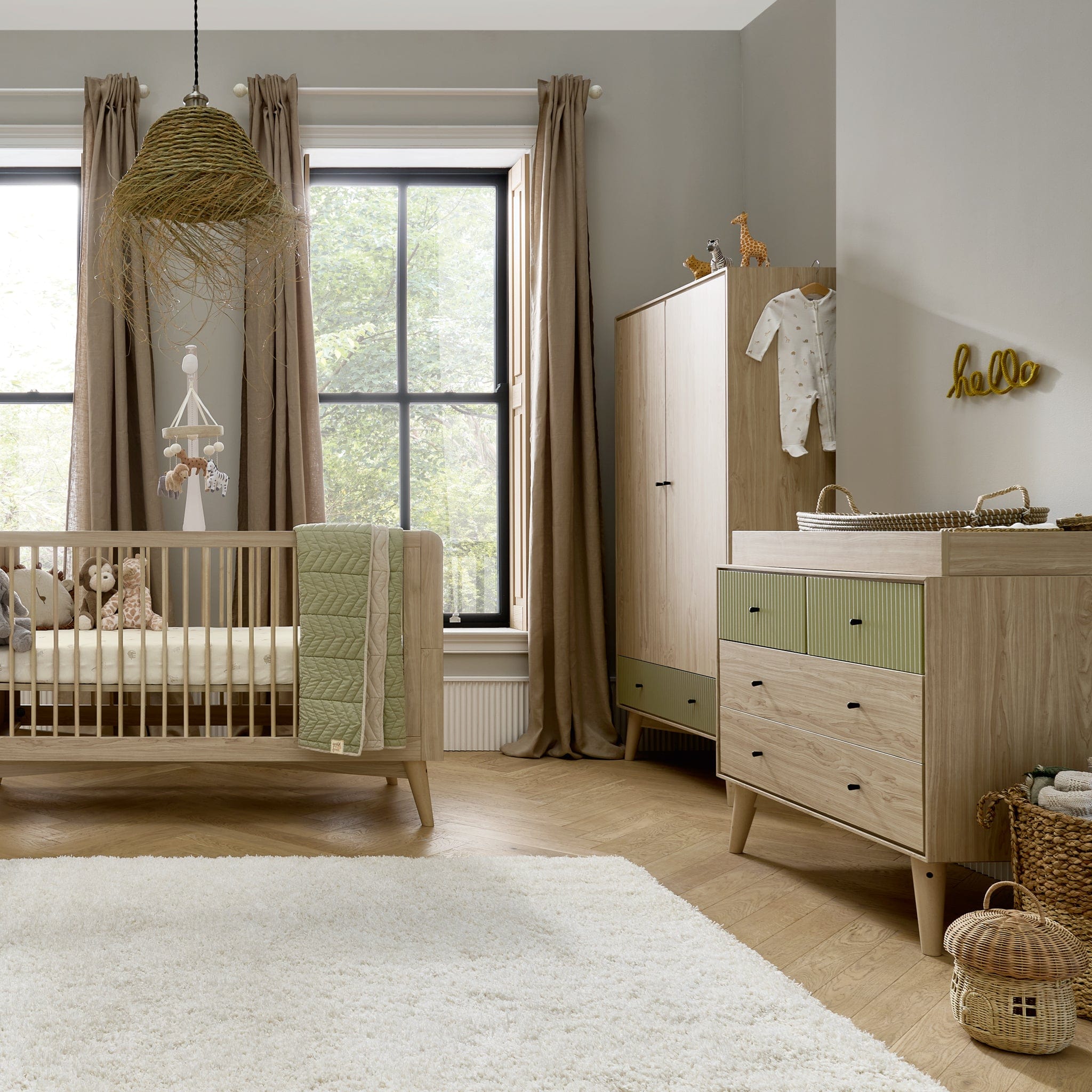 The Coxley Range in Natural/Olive or White would make the perfect base for any nursery, with its midcentury style and contemporary colour palette it boasts character, originality and uniqueness. This range features the stylish Coxley oak Cotbed, the multipurpose Dresser/Changer and the double Wardrobe.