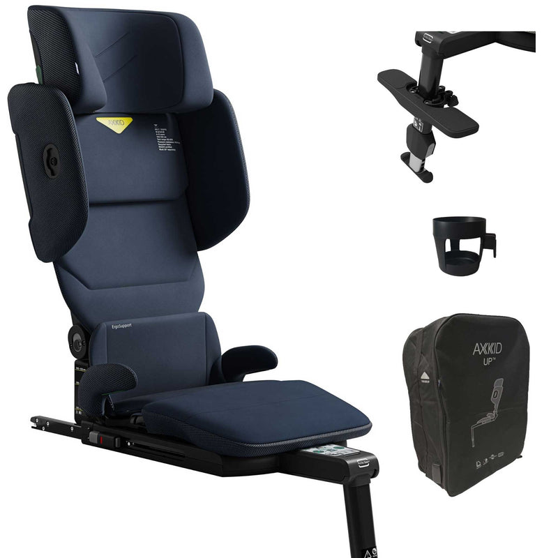 Bundle includes: Axkid Up™ booster seat, Axkid Up Leg Rest, Axkid Up Cup Holder, and Axkid Up Travel Bag