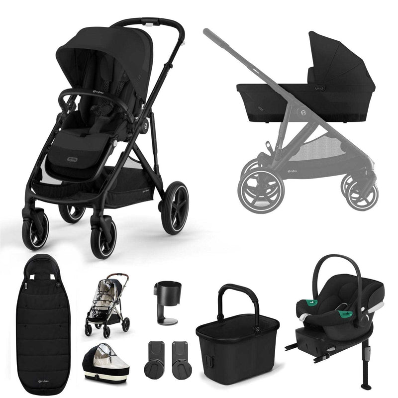 This bundle contains the Cybex Gazelle S Stroller, Gazelle S Carrycot, Shopping Basket, optional Snogga Footmuff or Gold Footmuff, Cup Holder, Car Seat Adapters, Pushchair Raincover and Carrycot Raincover, as well as the Cybex Aton B2 Car Seat and ISOFIX Base One.