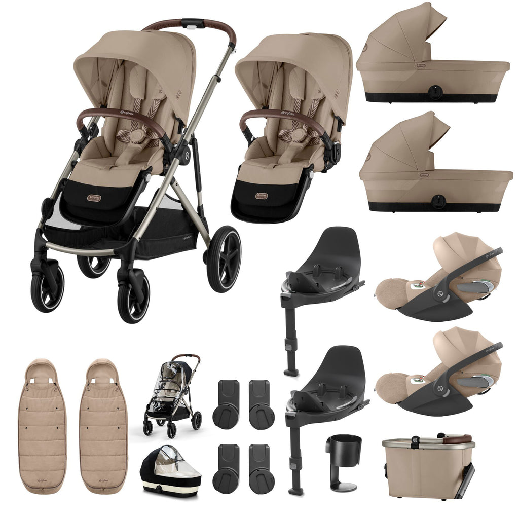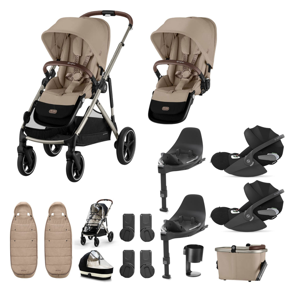 This bundle is travel system ready, making car-to-stroller transitions seamless. Included are 2x Cybex Cloud G or Cloud T infant car seats, which fit securely onto the Gazelle S chassis using the included car seat adapters. Approved for use from birth, these car seats provide side-impact protection, adjustable headrests, and a comfortable, cosy interior for newborns. Now, whether you’re driving or strolling, your twins are safely and comfortably covered.
