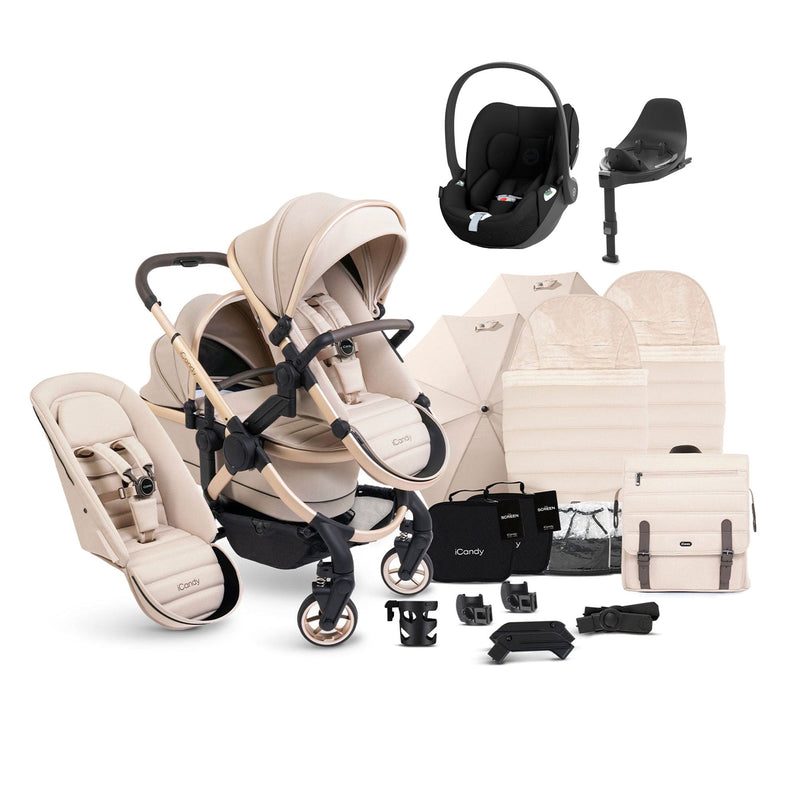 Step into seamless parenting with the iCandy Peach 7 Double Complete Cybex Travel System in Biscotti. Designed for first-time parents and growing families, this luxurious single-to-double pushchair combines cutting-edge engineering with modern style. Its premium knitted jersey fabrics and elegant design deliver both comfort for your little ones and sophistication for you. With a comprehensive set of accessories included, you’ll be ready to take on every adventure in style.