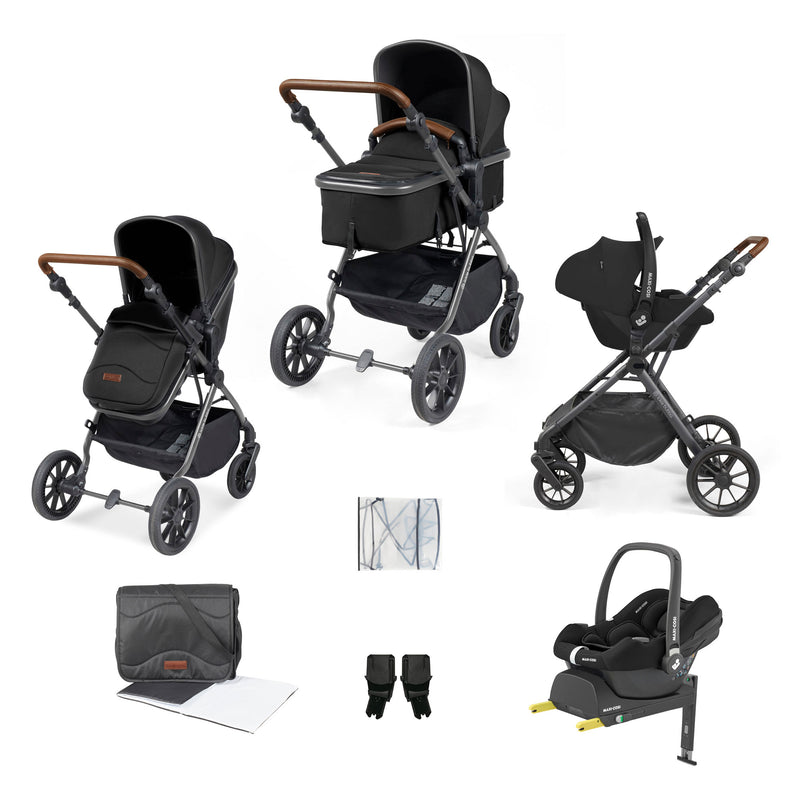 Meet the Ickle Bubba Cosmo 9 Piece Travel System with Maxi-Cosi CabrioFix i-Size Car Seat and ISOFIX Base in Black with Gunmetal Chassis and Tan Handle—a stylish, practical, and budget-friendly companion for every family adventure. Designed to make life easier from the moment your little one arrives, Cosmo blends comfort, convenience, and trusted safety into one complete package. Whether you’re heading out for a gentle morning stroll or navigating the lively pace of everyday errands, this travel system keeps your baby snug while giving you the confidence to tackle each day with ease.