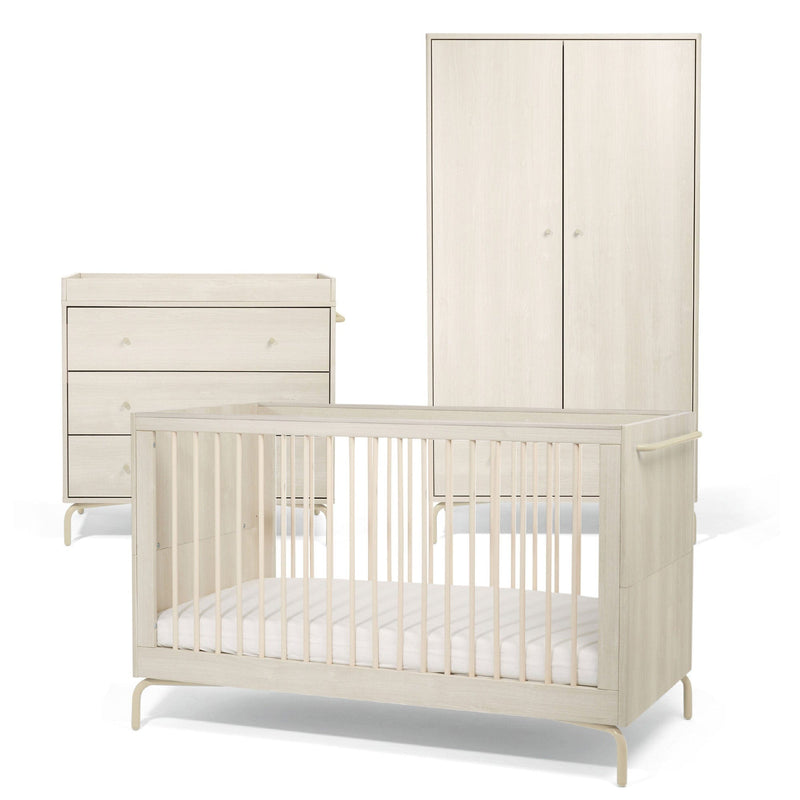 Its three spacious, soft-close drawers provide plenty of room for clothing, nappies, and essentials while keeping the nursery calm and quiet. Like the rest of the collection, the dresser features curved metal legs, rounded corners, and a natural wood finish for a cohesive, contemporary look.