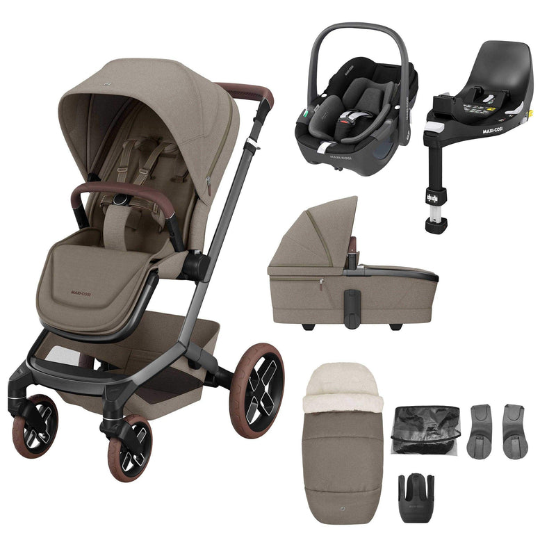 For families who love to explore, the Fame Complete Bundle offers everything you need for a comfortable and convenient adventure. The bundle includes the Pebble 360 car seat and the FamilyFix 360 base. The bundle includes a rain cover, 2-in-1 footmuff, cup holder, phone holder, modern travel bag, and car seat adapters, along with the gorgeous Fame pushchair and carrycot.