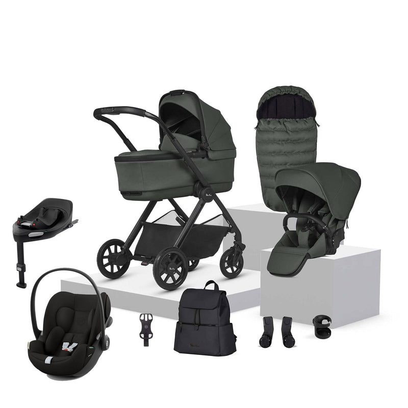 The Silver Cross Reef 2 package includes everything you need for a comfortable and stylish journey. This comprehensive set features the chassis, seat unit, an overnight sleeping approved foldable carrycot lined in soft bamboo, hood, Cybex Car Seat, and Base, coordinating vegan leather changing backpack with changing mat, thermal padded footmuff, cup holder, phone holder, spacious shopping basket, bumper bar, Dream car seat adaptors, universal car seat adaptors, and raincover.