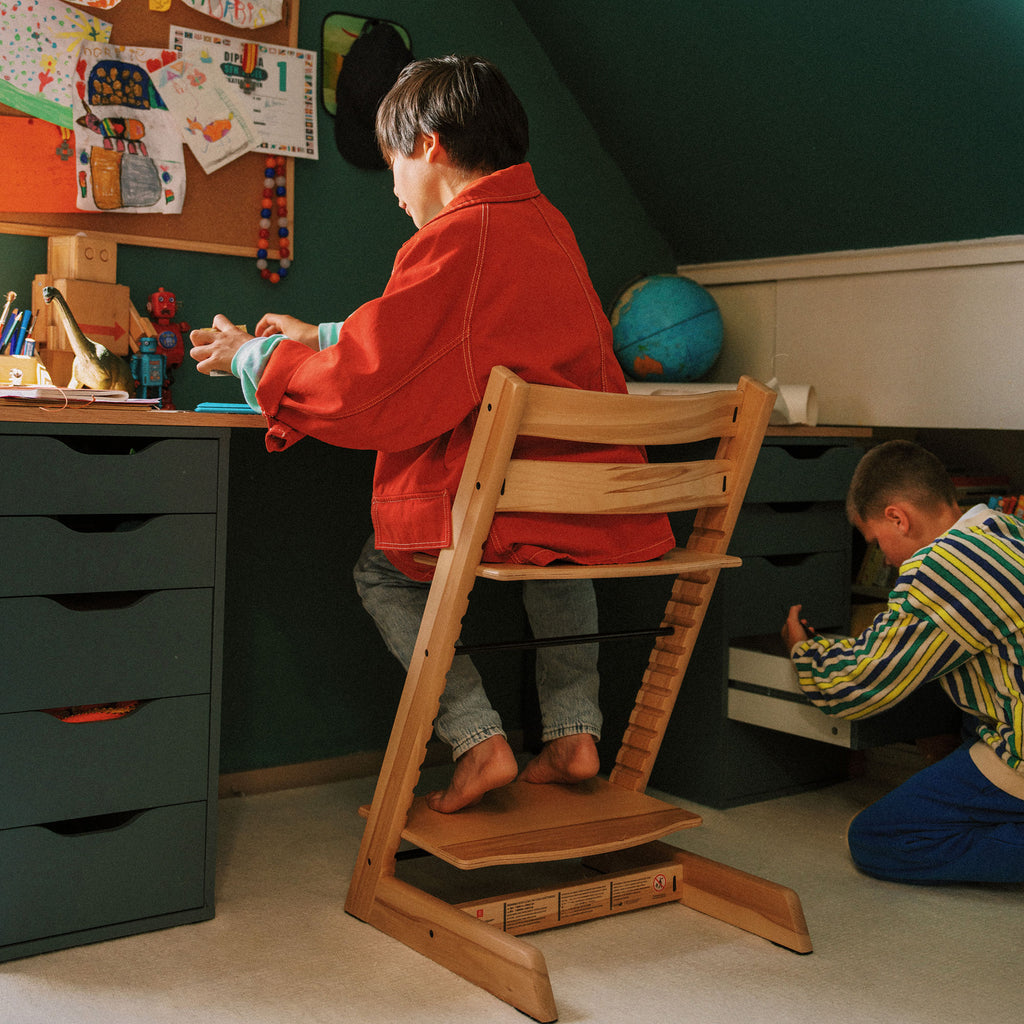 Safety is at the heart of the Tripp Trapp® design. The chair meets all international safety standards, giving parents complete peace of mind. At the same time, its open, supportive structure encourages independence, allowing children to climb in and out on their own — helping to develop balance, coordination and confidence.
