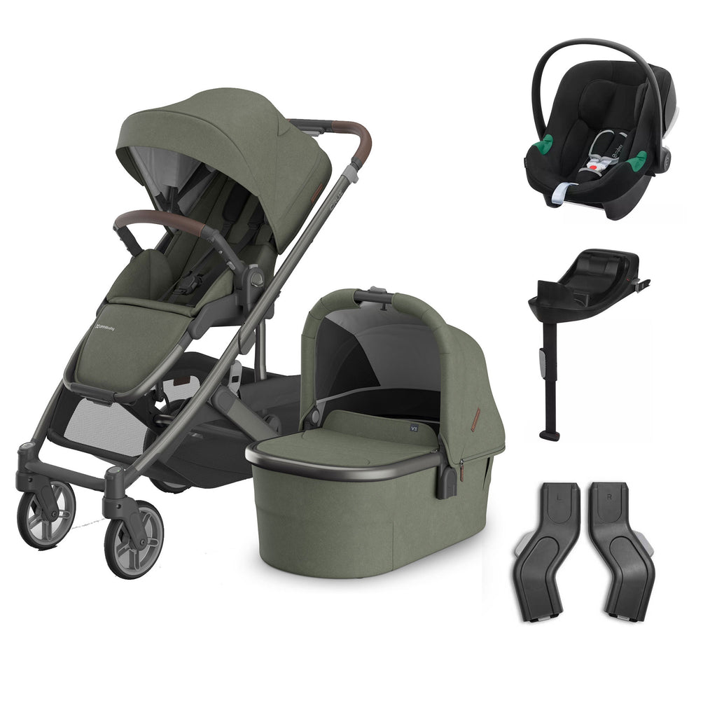 Complete travel system: Cruz V3 stroller, UPPAbaby carrycot, and CYBEX infant car seat