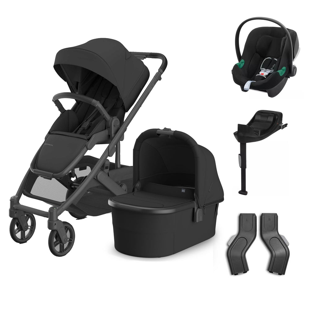 Complete travel system: Cruz V3 stroller, UPPAbaby carrycot, and CYBEX infant car seat