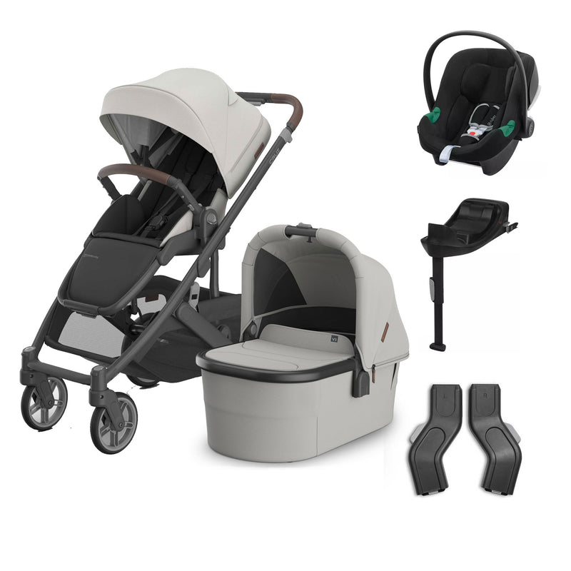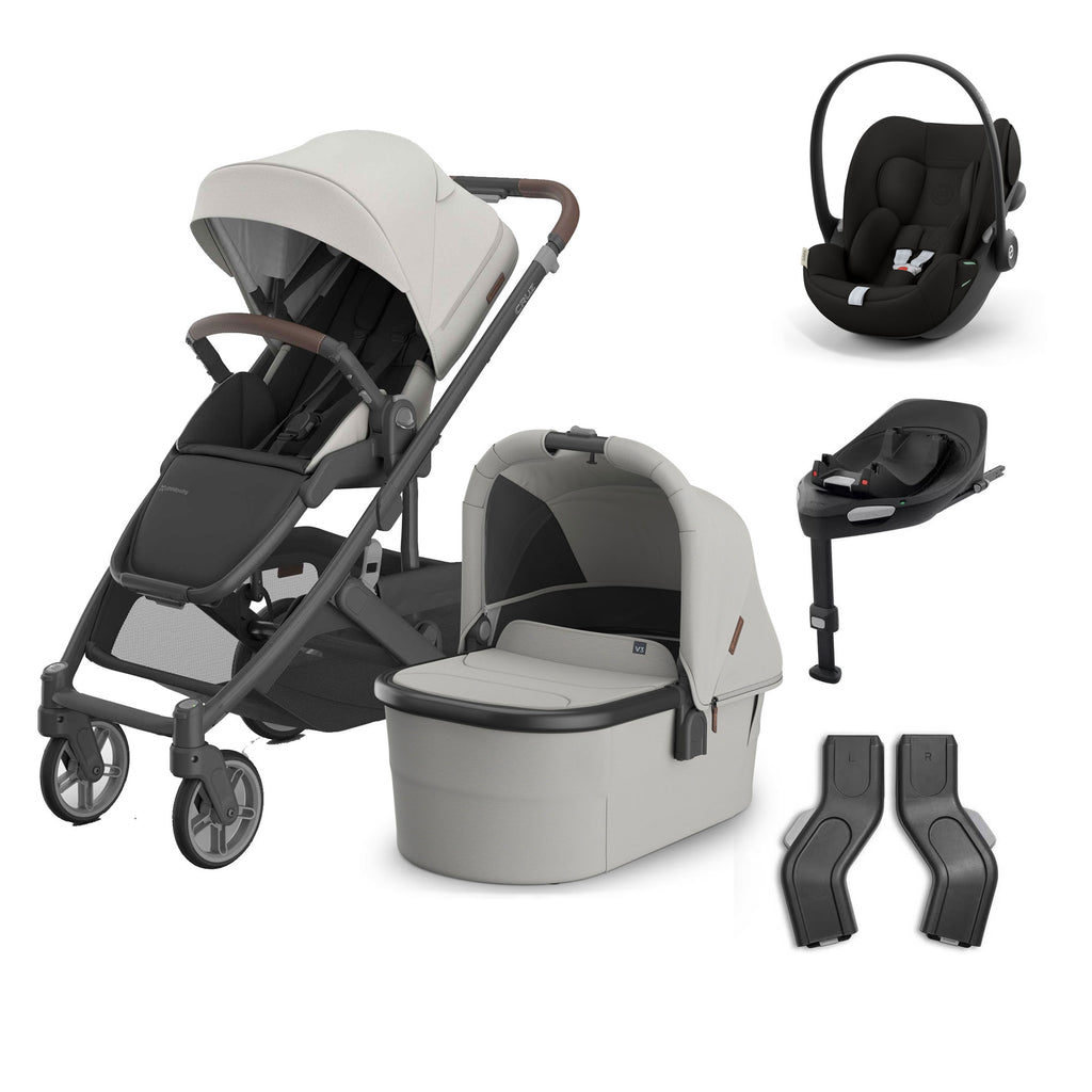 Complete travel system: Cruz V3 stroller, UPPAbaby carrycot, and CYBEX infant car seat